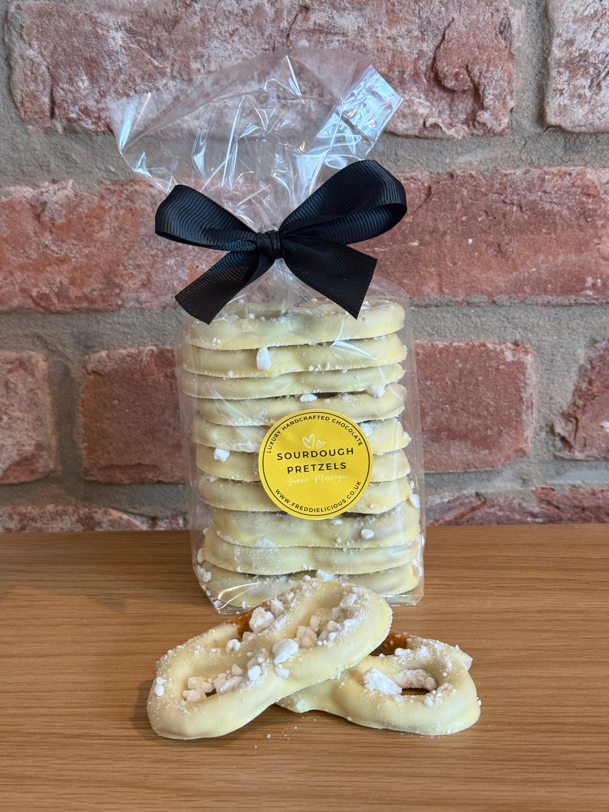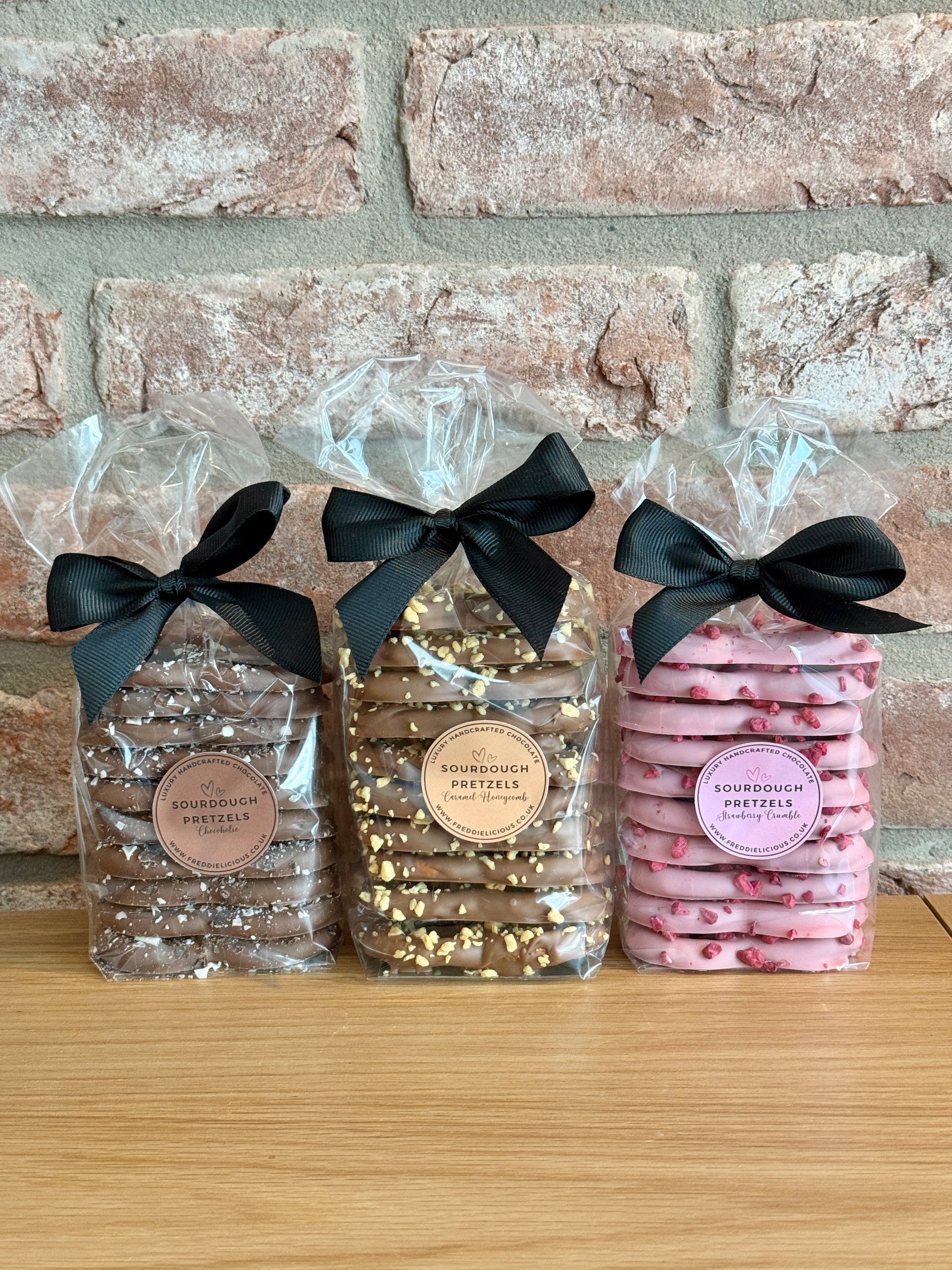 Giant sourdough pretzels smothered with your choice of Belgian chocolate and toppings!