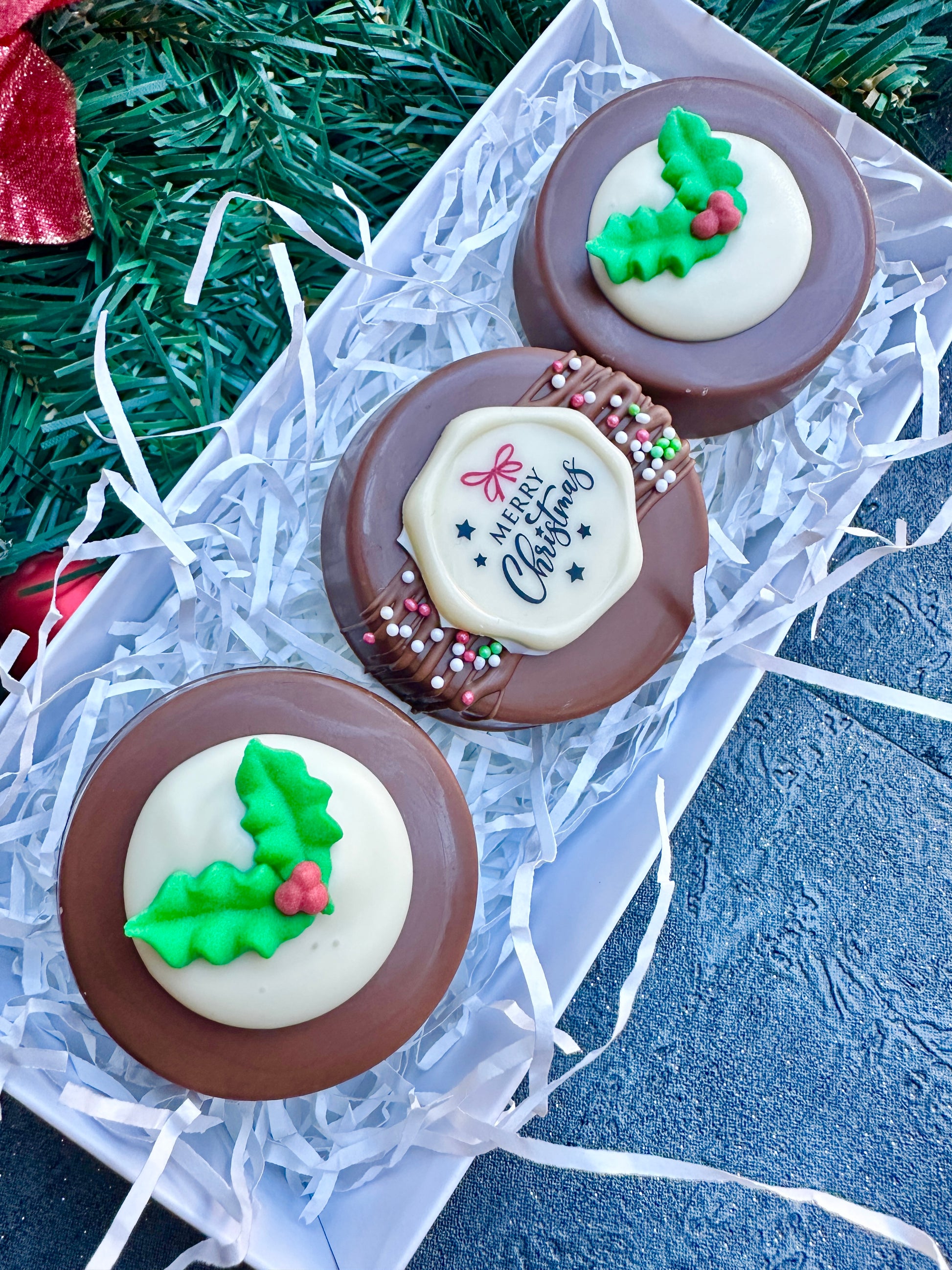 A lovely festive gift box of 3 chocolate covered biscuits. 2 decorated like Christmas puddings and 1 Merry Christmas topper & sprinkles.