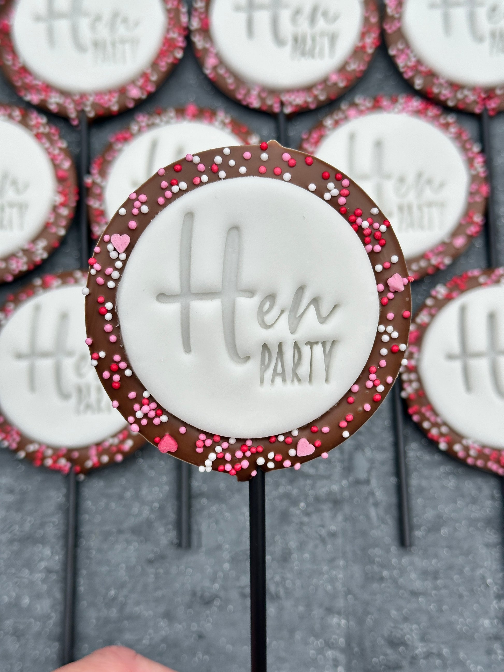 A round chocolate lollipop topped with a fondant ‘Hen Party’ topper and sprinkles.