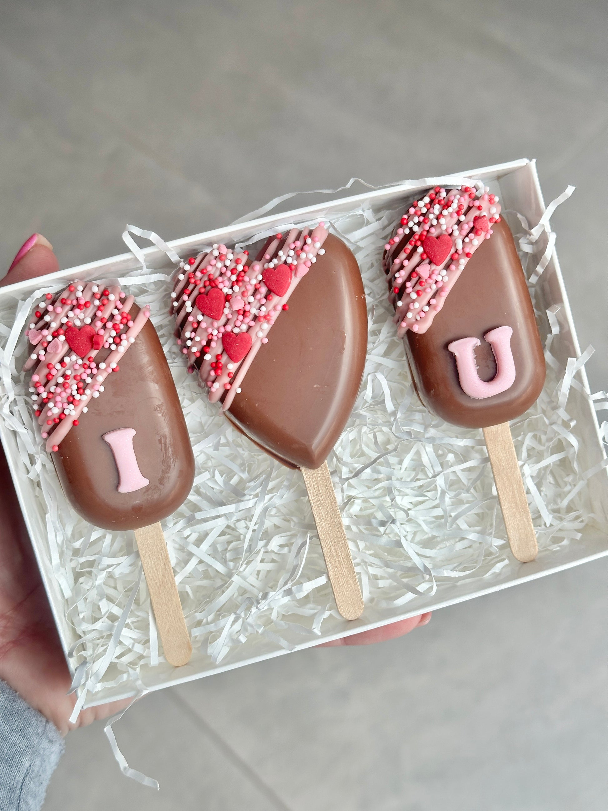 Chocolate pops filled with chocolate brownie and coated in delicious Belgian chocolate, decorated with strawberry chocolate and valentines sprinkles.