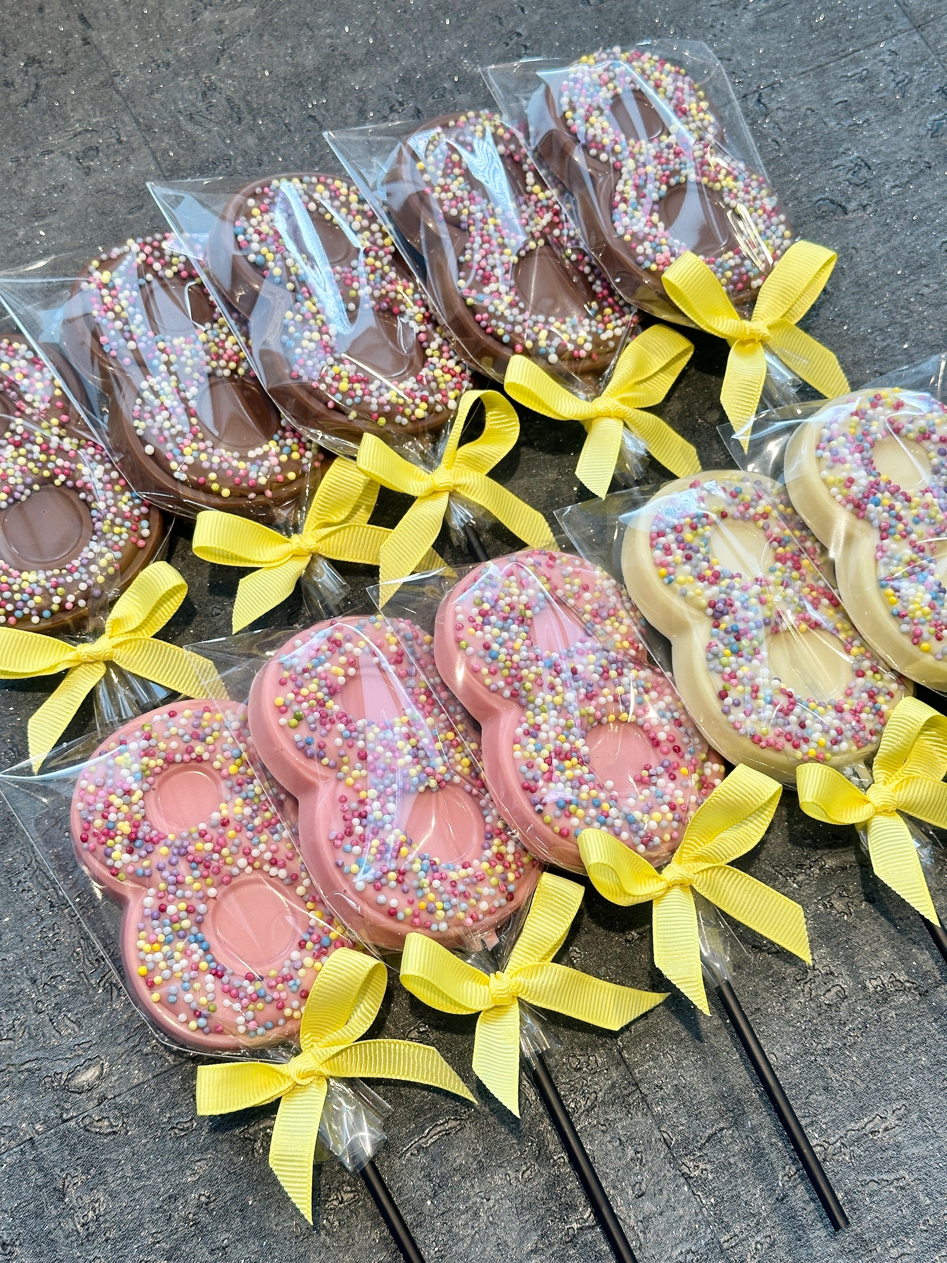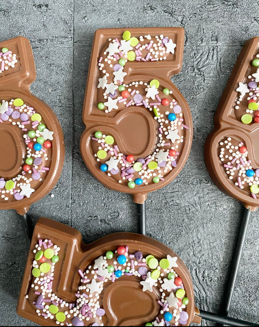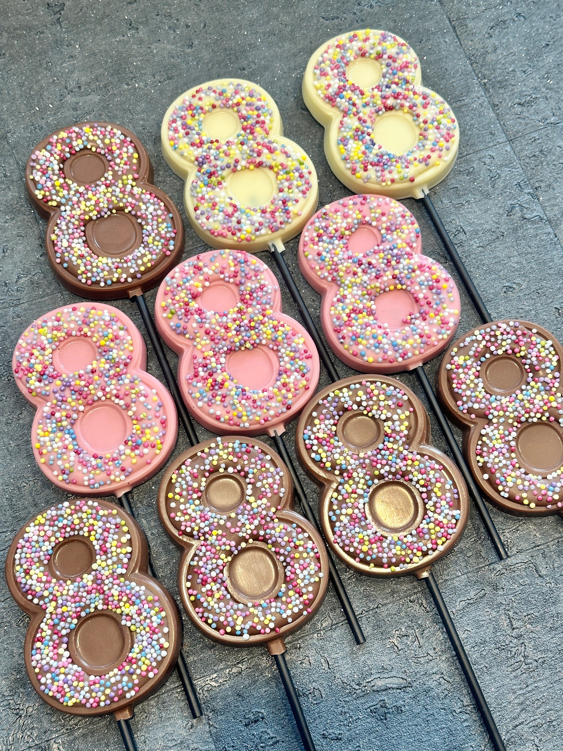 A Belgian chocolate number lollipop. Can be left plain or with sprinkles of your choice.