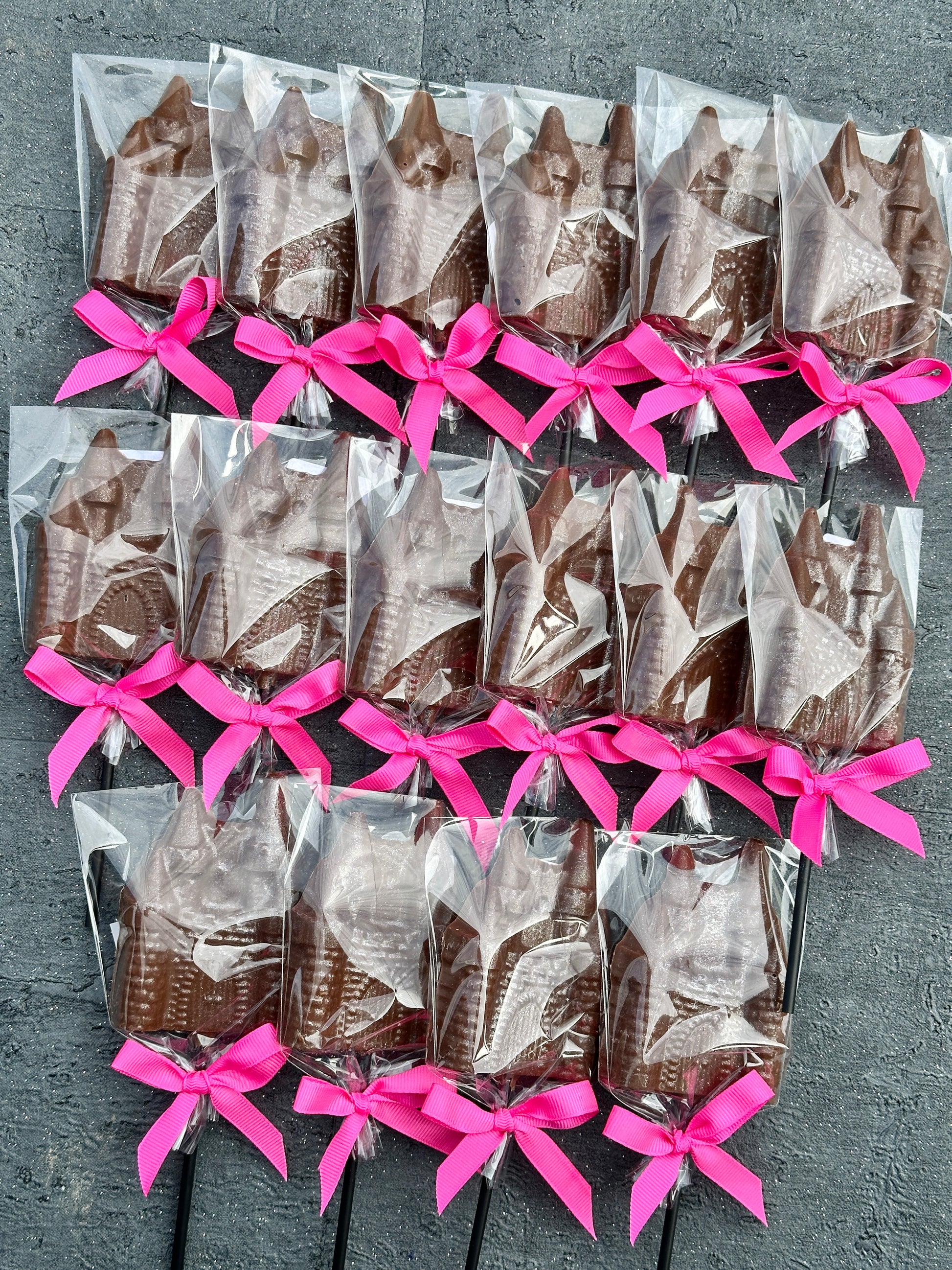 Lollipops come wrapped in cellophane and tied with your choice of ribbon.