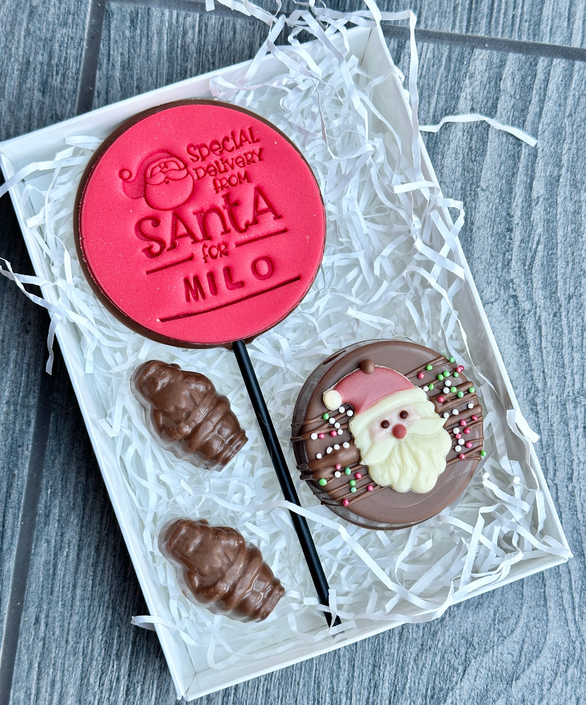 -Chocolate covered biscuit (Oreo, shortbread or biscoff) topped with a chocolate Santa