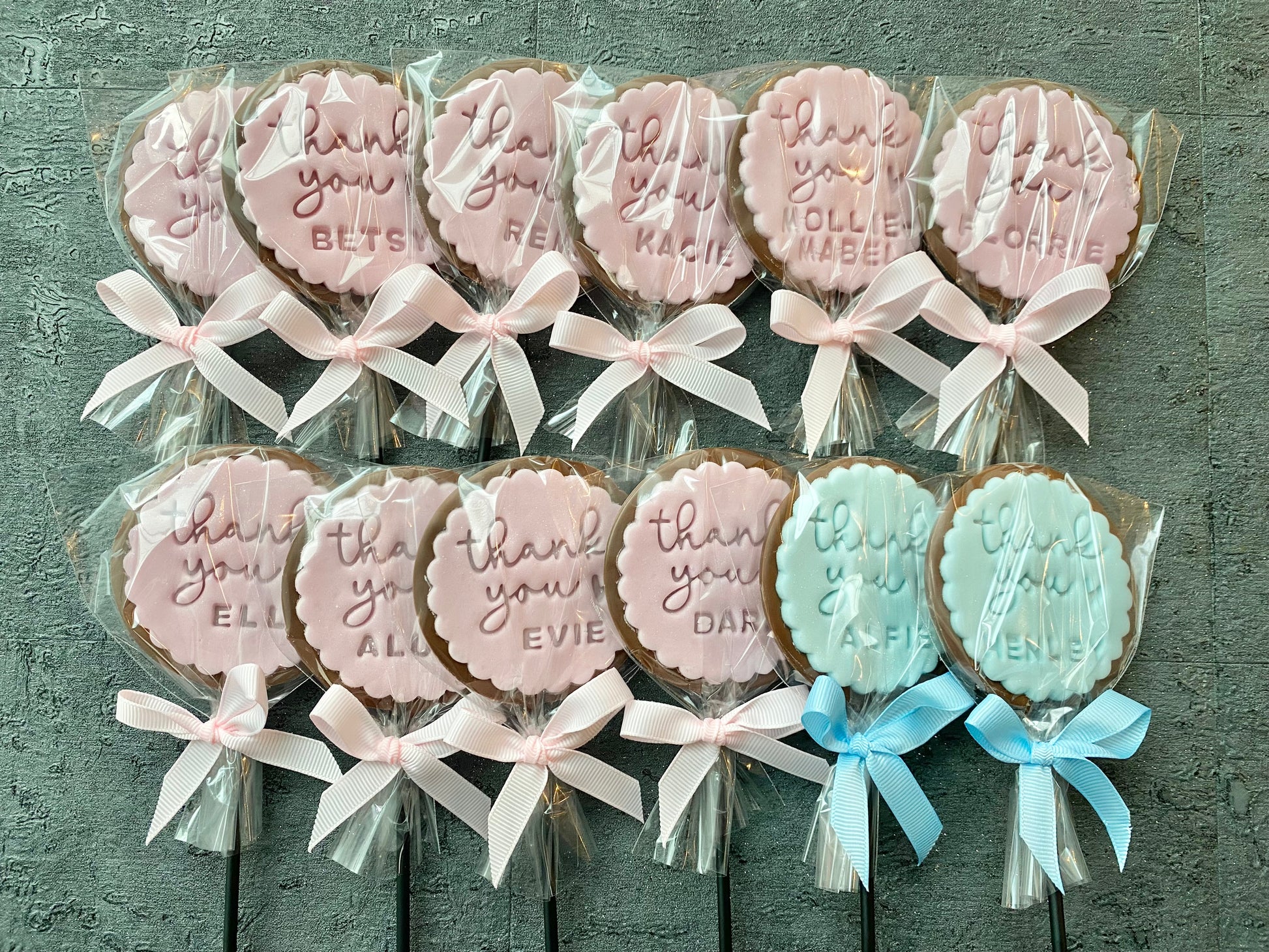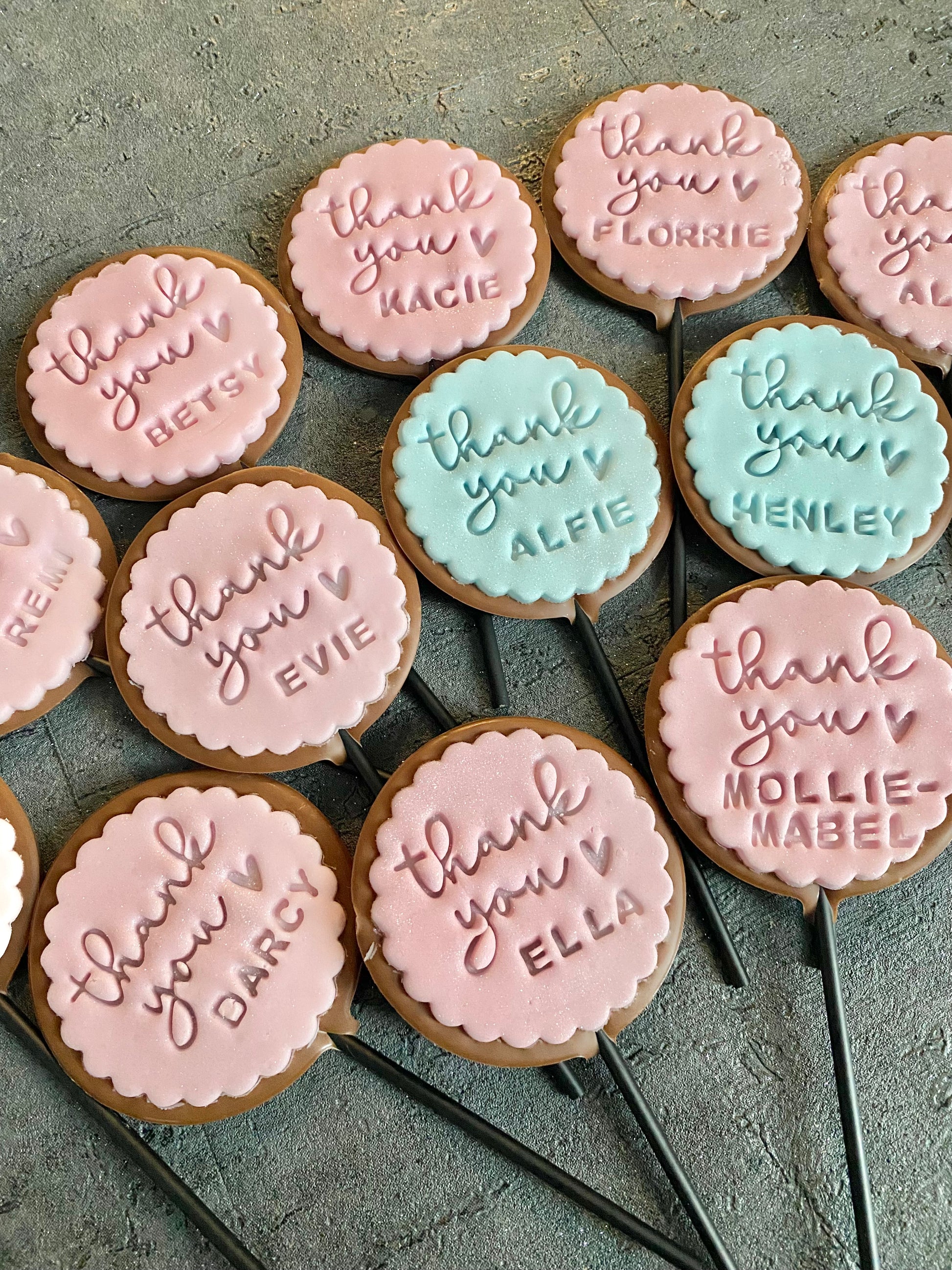 A round chocolate lollipop topped with a thank you fondant topper. Fondant can be changed to match party theme and can be personalised or left blank