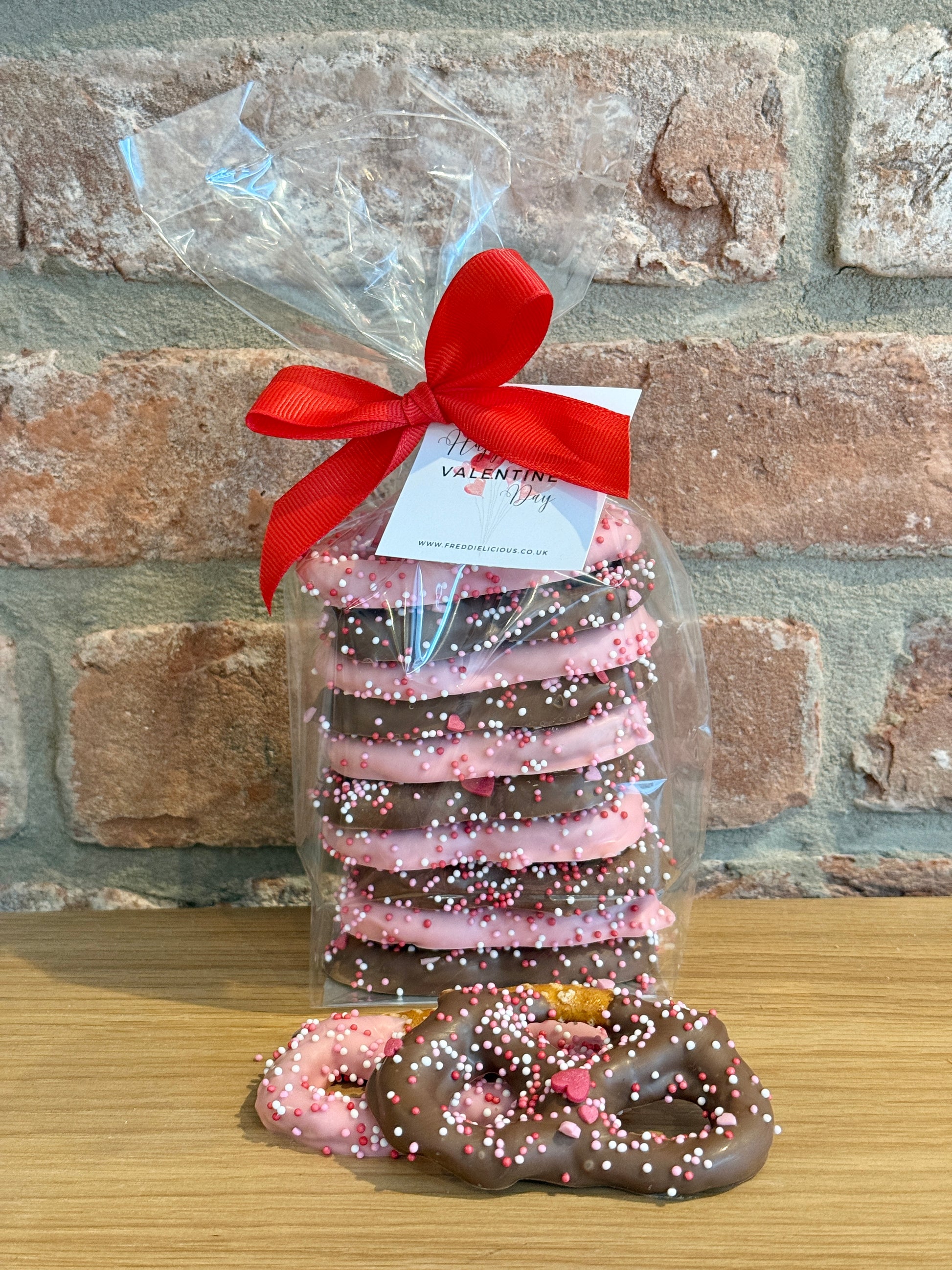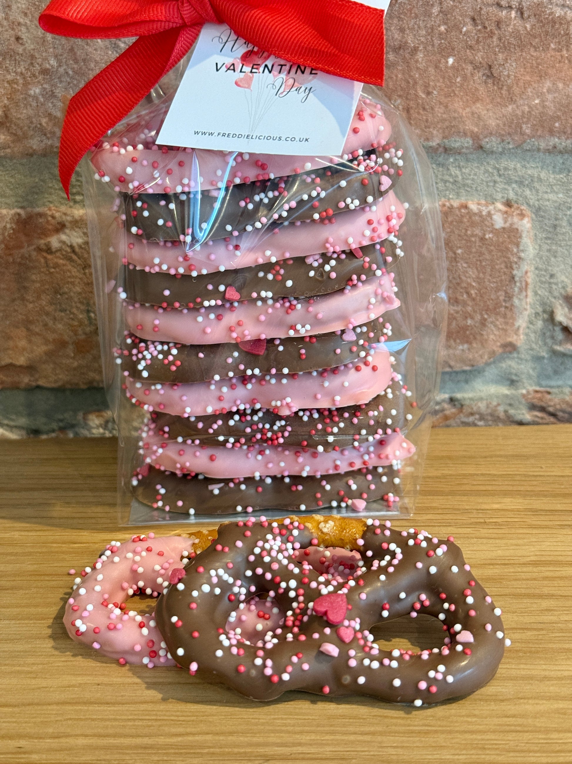 Giant sourdough pretzels smothered with milk & strawberry Belgian chocolate and sprinkled with valentine 100 & 1000’s